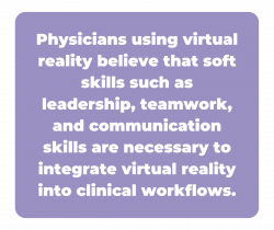 Involving a wider range of professionals may also encourage more investment in virtual reality telehealth projects by drawing on a wider variety of funding sources and areas of expertise. For example, information technology staff and graphic designers contribute versatility to virtual reality medical professionals. Because virtual reality draws on artistic, medical, and technological skillsets, physicians using virtual reality believe that soft skills such as leadership, teamwork, and communication skills are necessary to effectively integrate virtual reality into clinical workflows.