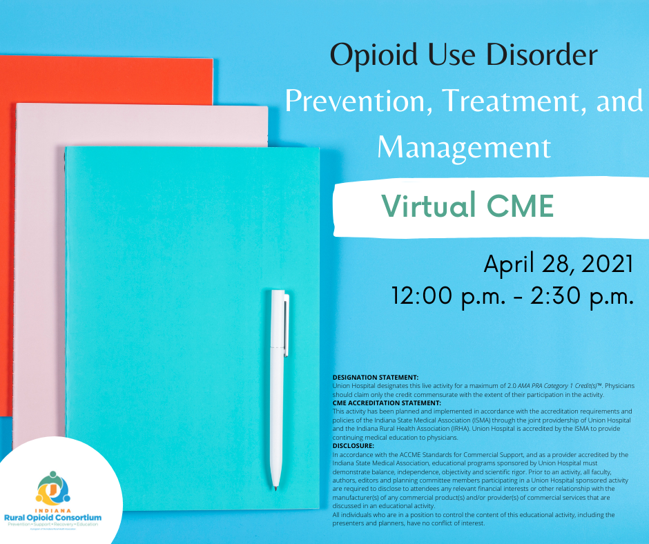 The Indiana Rural Opioid Consortium (InROC) will host a virtual continuing medical education program on April 28, 2021 at 12:00 p.m. EST. We welcome Dr. Michael Wheelis, MD who will be presenting “Opioid Use Disorder Prevention, Treatment, and Management." This program has been approved for AMA Category 1 Credit™ which can be used to help satisfy the IN SEA 225 requirement.